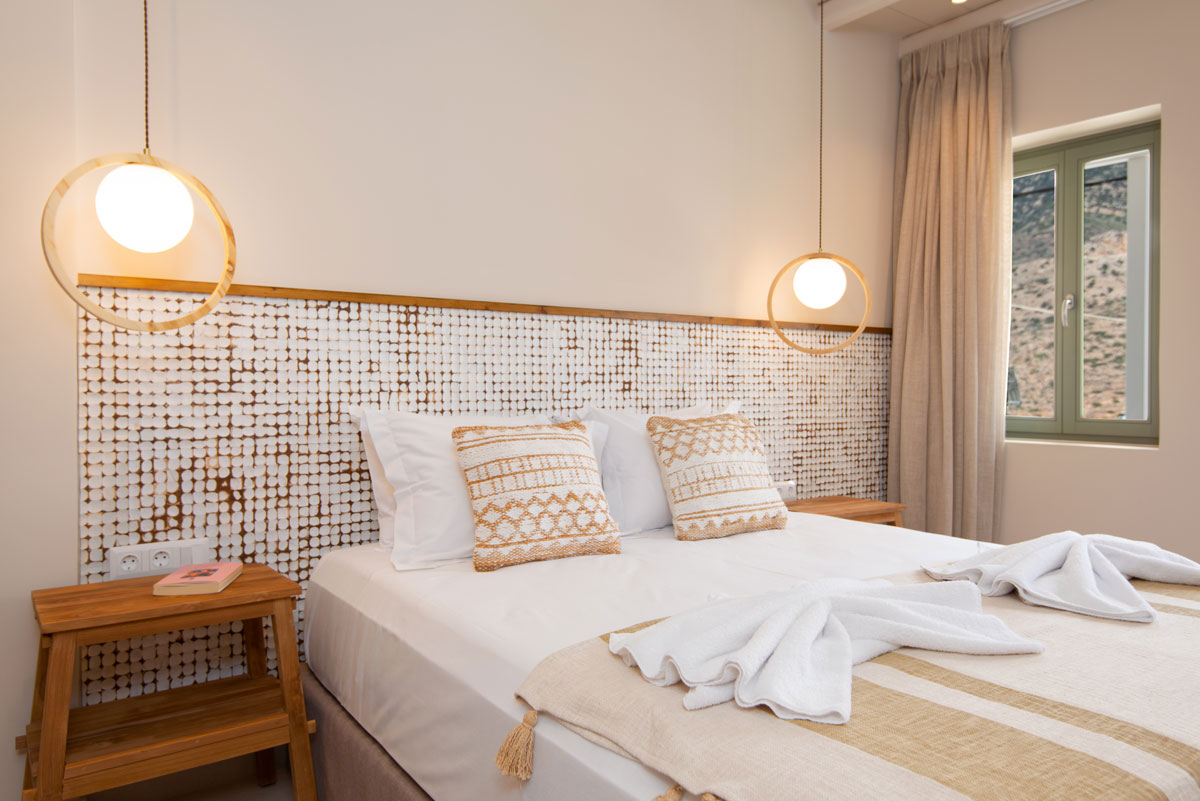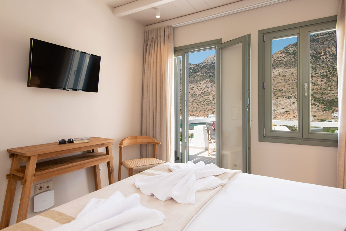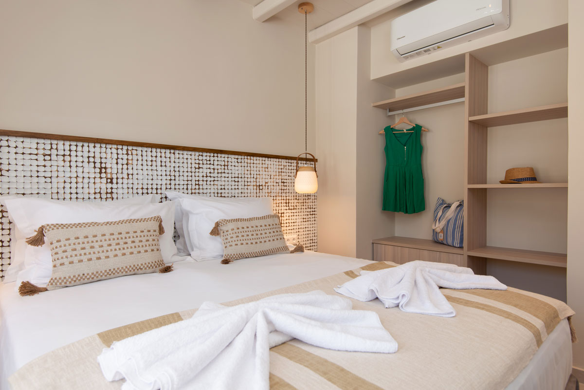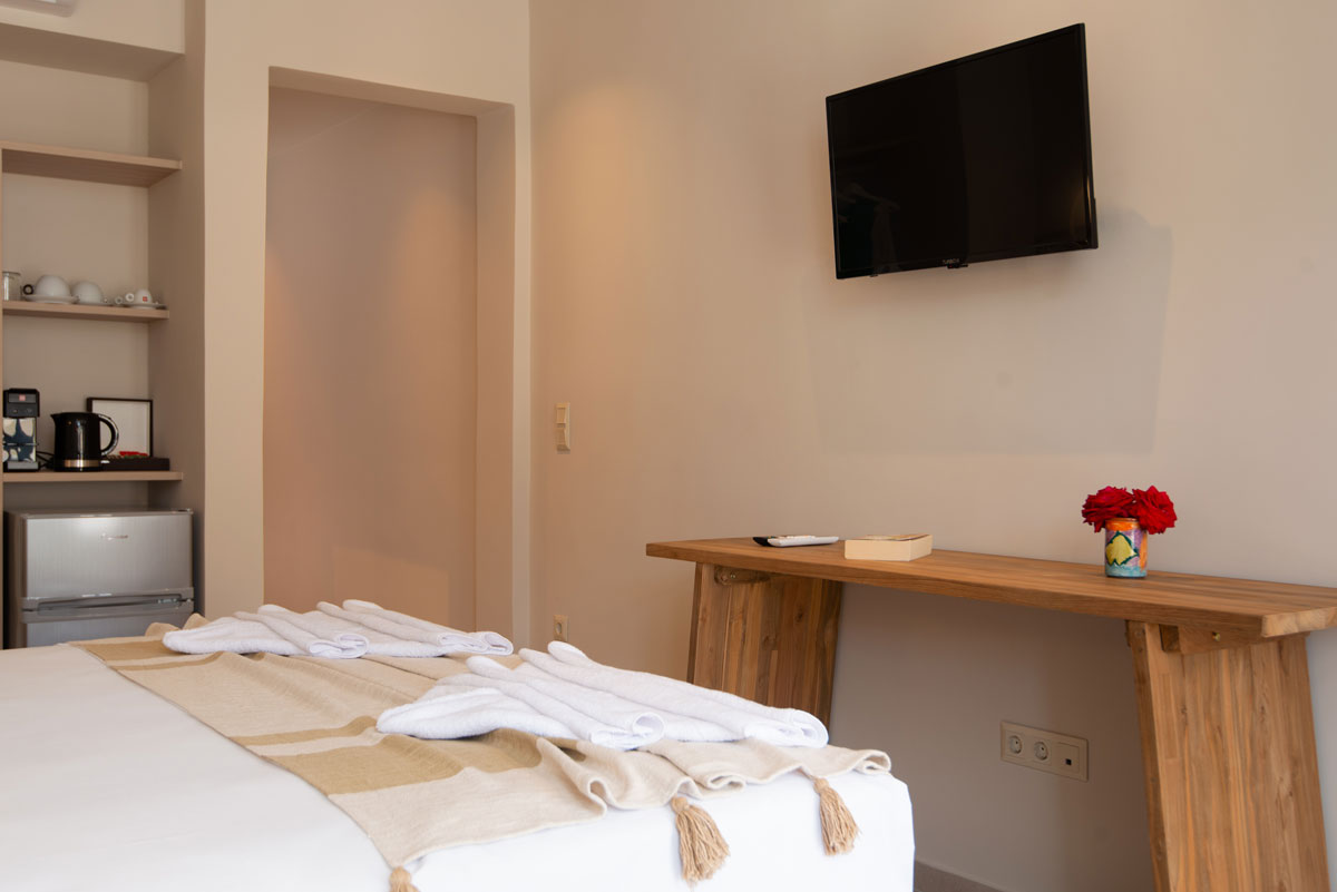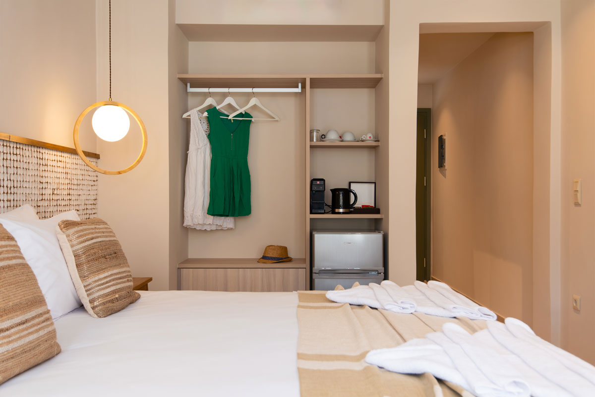 Μοντέρνα δίκλινα δωμάτια με ιδιαίτερες διακοσμητικές πινελιές και άνετα διπλά κρεβάτια. Διαθέτουν μικρό ψυγείο, καφετιέρα για εσπρέσο, μπάνιο με ντουζιέρα-βροχή ενώ κάποια είναι εξοπλισμένα και με καναπέ. Στο σκιερό μπαλκόνι μπορείτε να απολαύσετε τη θέα στη θάλασσα, στην παραλία των Καμαρών και στο ηλιοβασίλεμα.