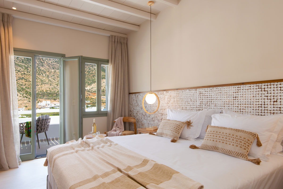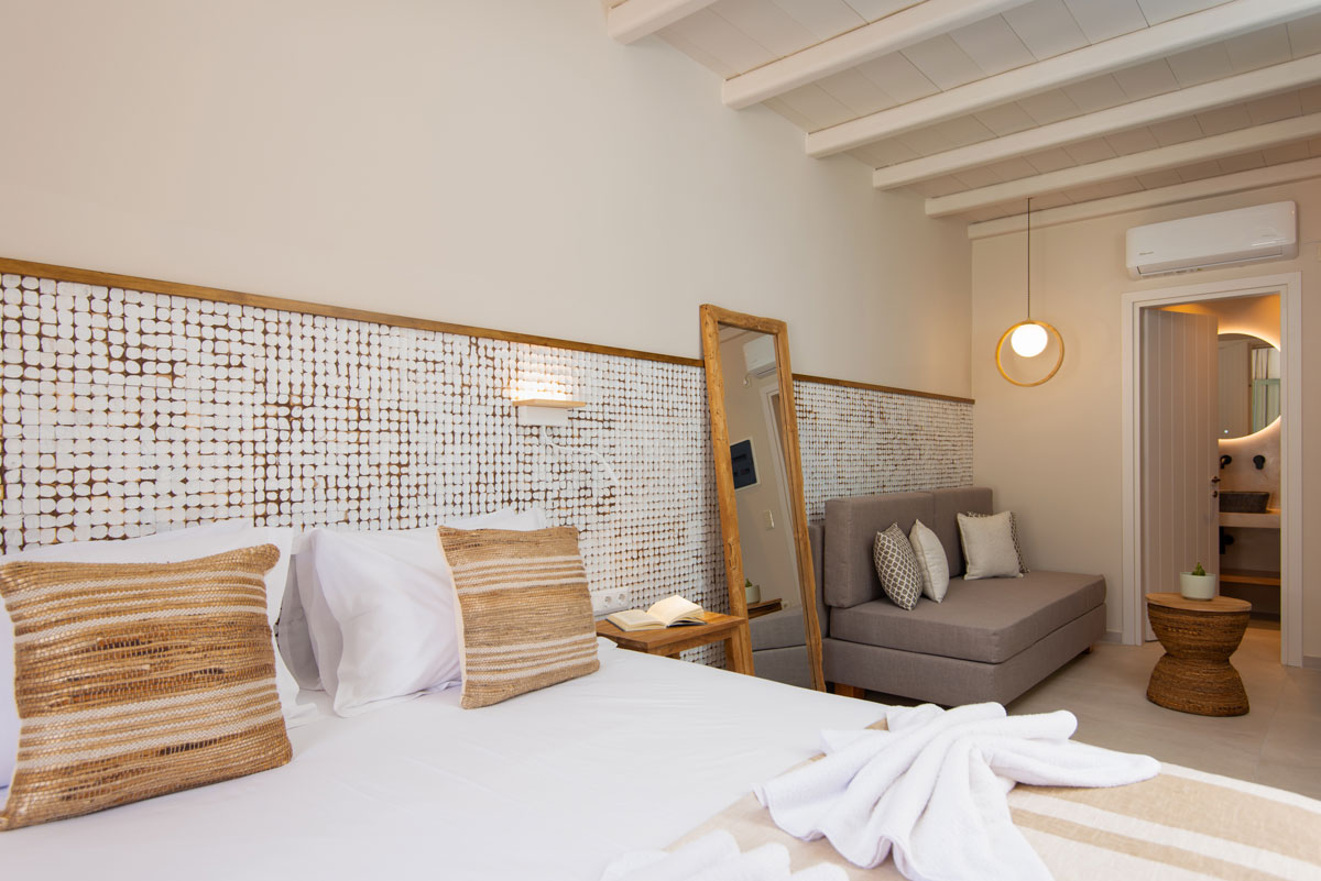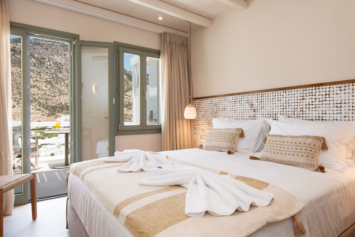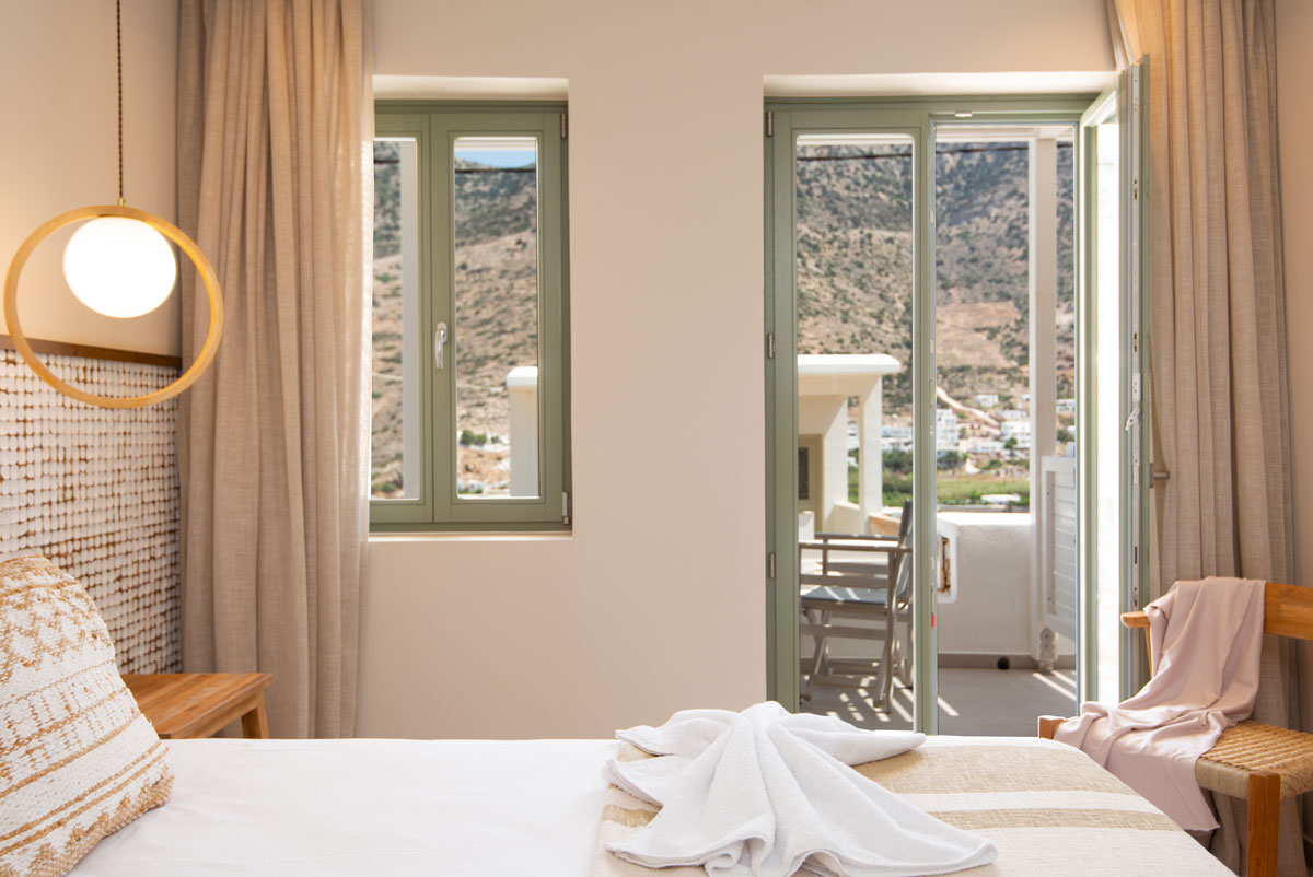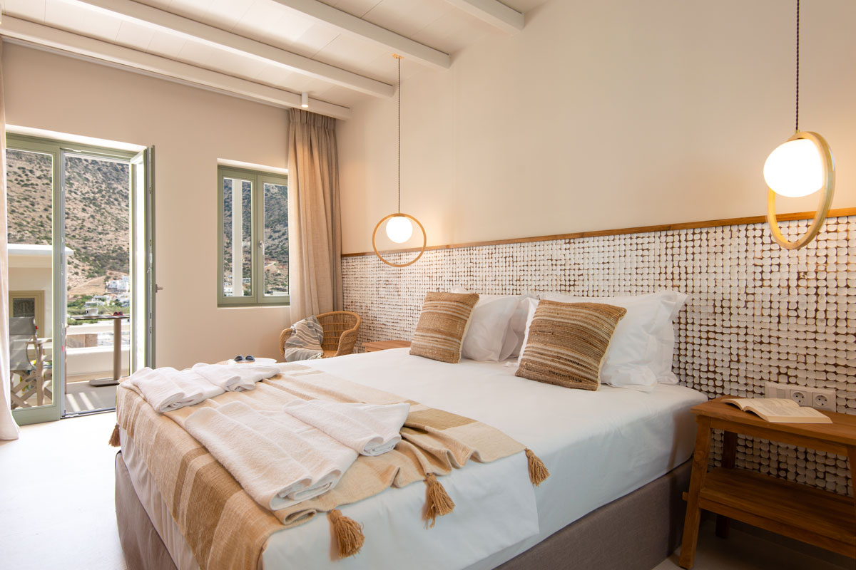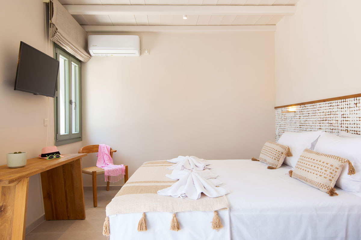Μοντέρνα δίκλινα δωμάτια με ιδιαίτερες διακοσμητικές πινελιές και άνετα διπλά κρεβάτια. Διαθέτουν μικρό ψυγείο, καφετιέρα για εσπρέσο, μπάνιο με ντουζιέρα-βροχή ενώ κάποια είναι εξοπλισμένα και με καναπέ. Στο σκιερό μπαλκόνι μπορείτε να απολαύσετε τη θέα στη θάλασσα, στην παραλία των Καμαρών και στο ηλιοβασίλεμα.