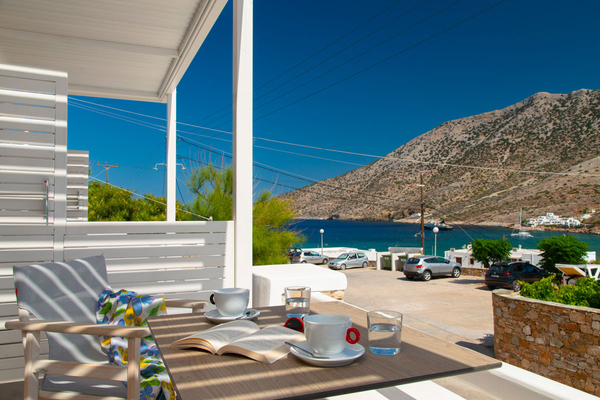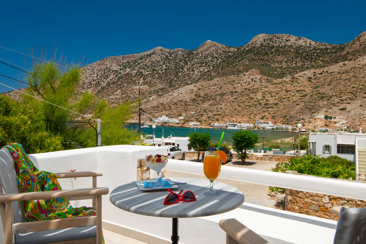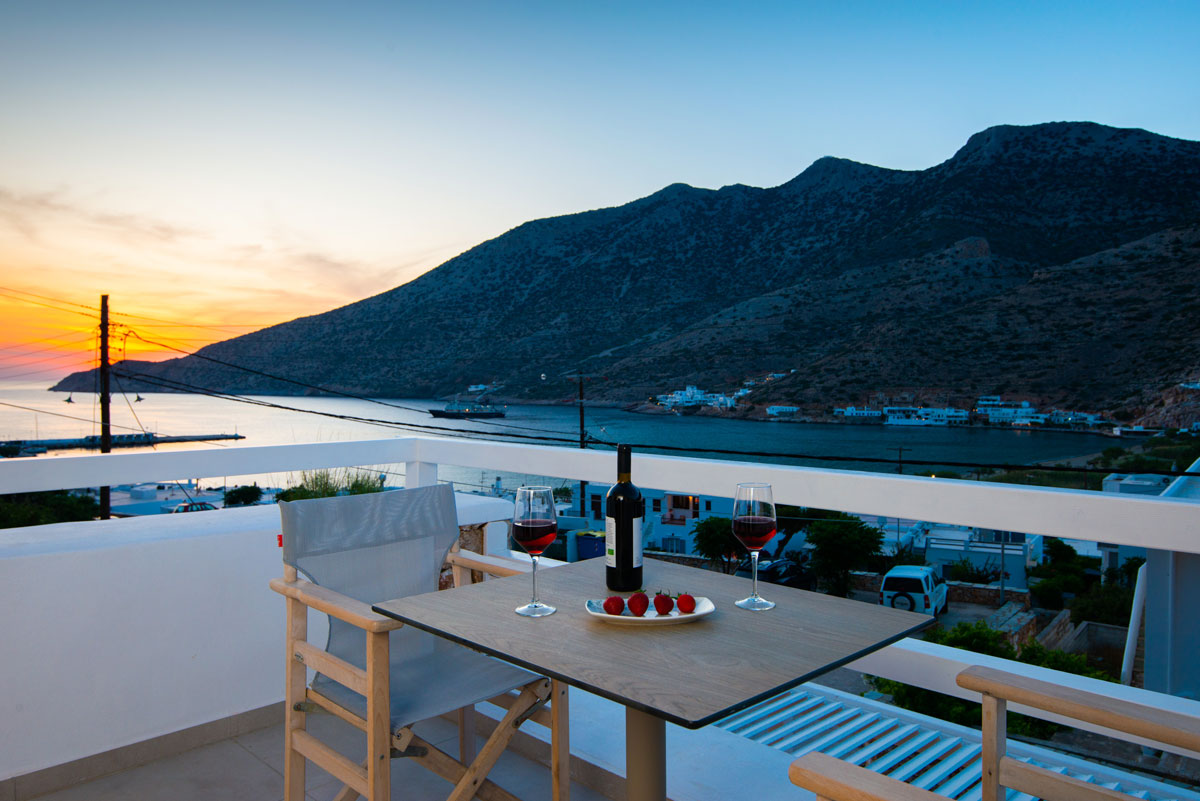Στο μπαλκόνι στη σκιά της πέργκολας μπορείτε να απολαύσετε το καφεδάκι ή το ποτό σας με θέα στη θάλασσα, στην παραλία των Καμαρών και στο ηλιοβασίλεμα.