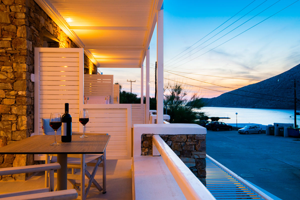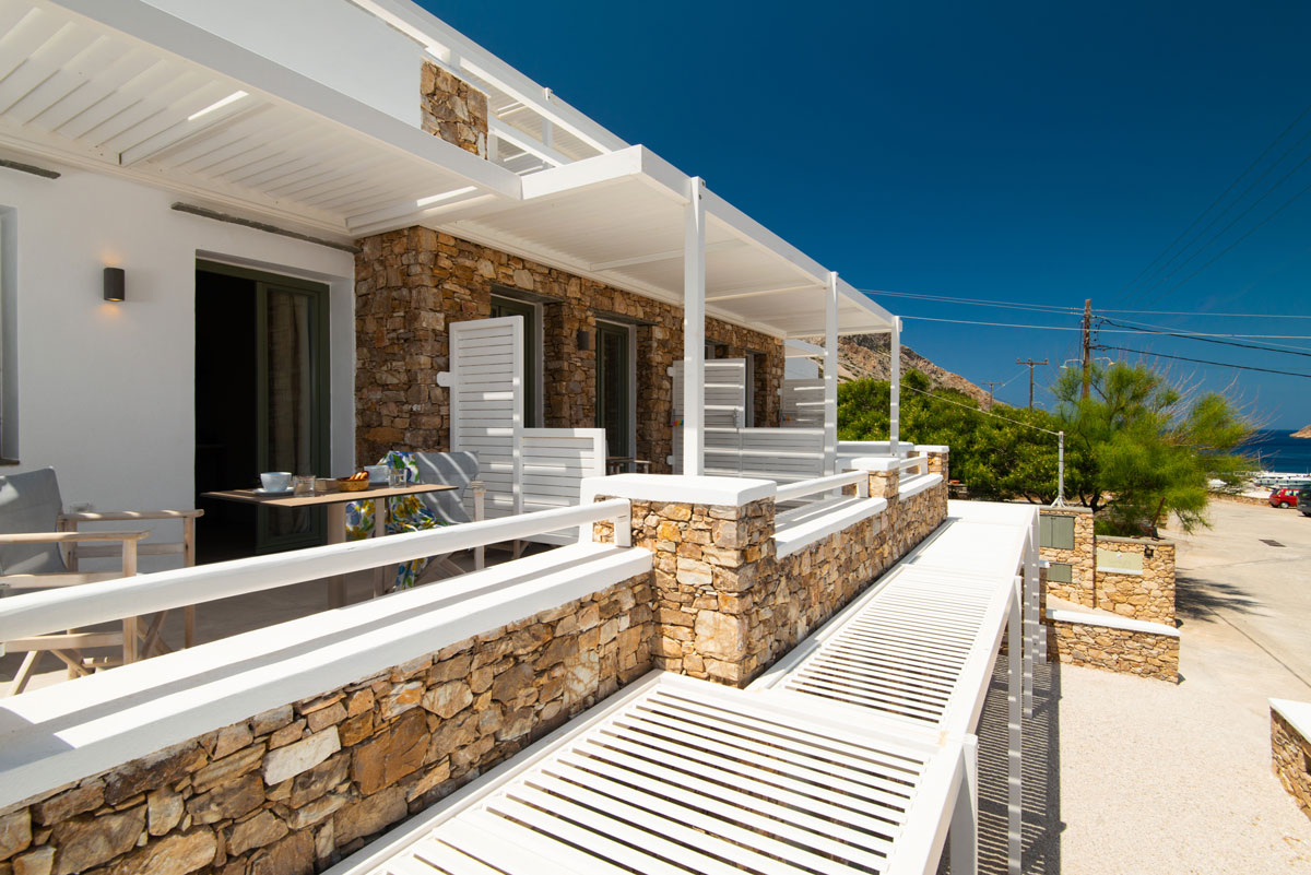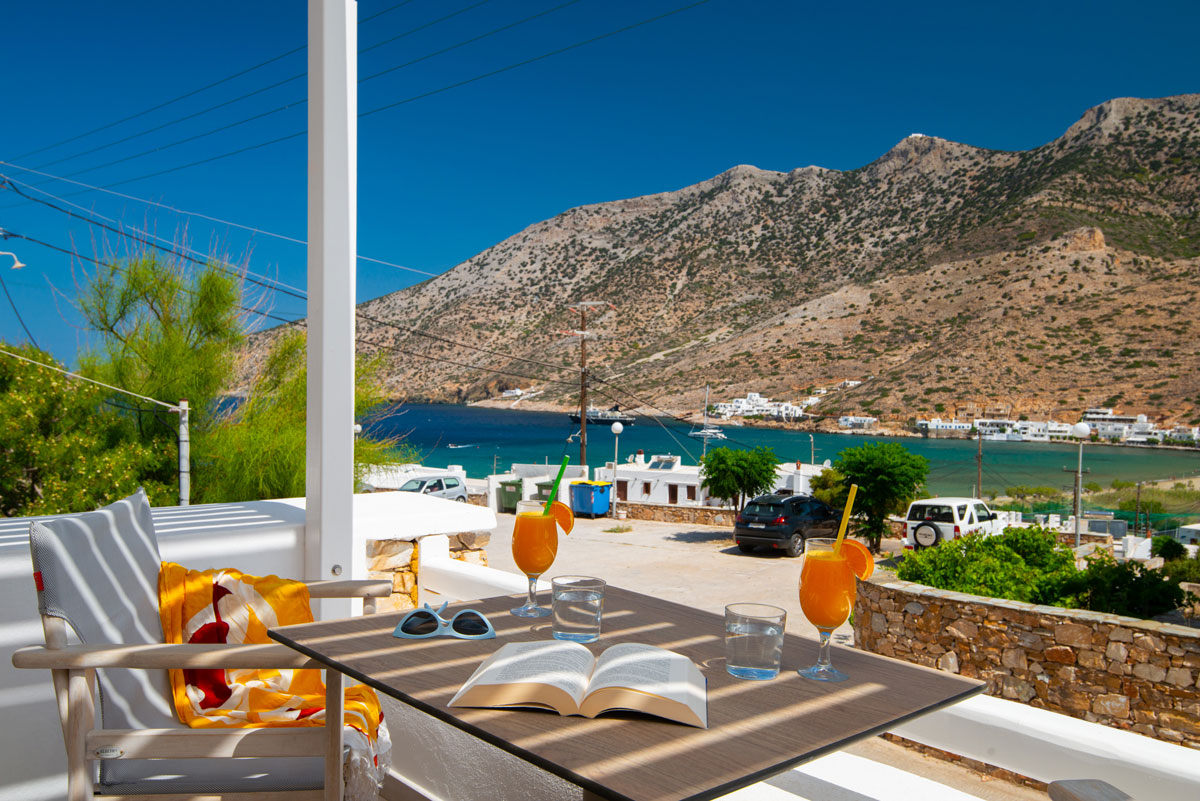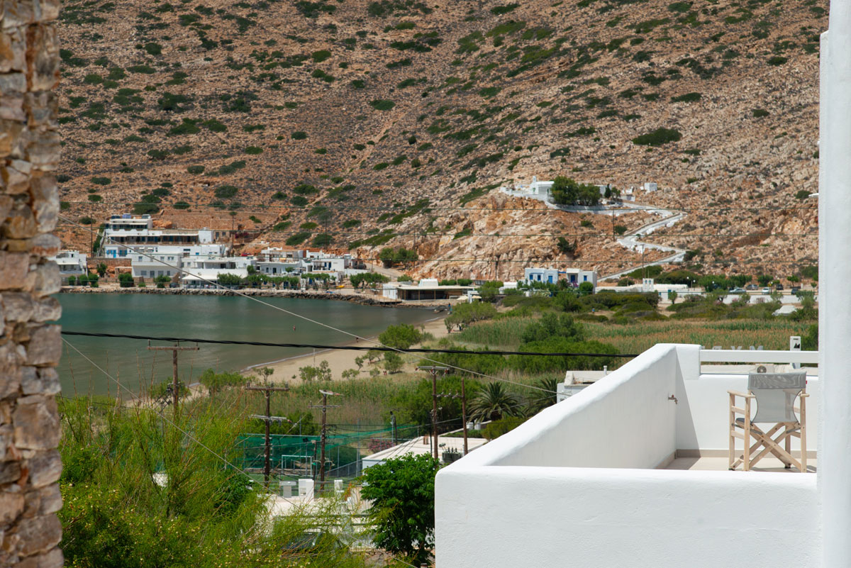 Στο μπαλκόνι στη σκιά της πέργκολας μπορείτε να απολαύσετε το καφεδάκι ή το ποτό σας με θέα στη θάλασσα, στην παραλία των Καμαρών και στο ηλιοβασίλεμα.